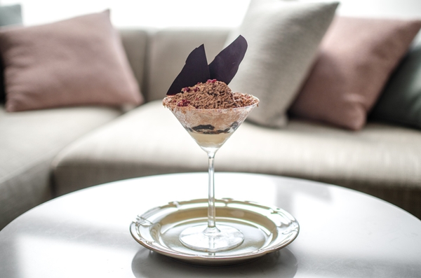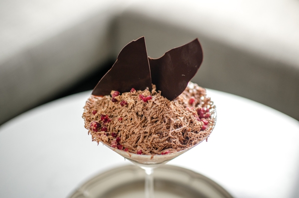 濃厚なチョコレートのかき氷に、パリパリとした食感の薄いチョコレートとカカオニブ、フランボワーズをトッピング。ほろ苦いヘーゼルナッツムースとコーヒーゼリーを合わせ、ラズベリーの酸味が絶妙なハーモニーを奏でる、ビターで多層的な味わいのパフェ氷です。