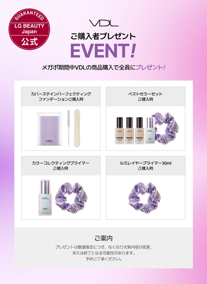 Qoo10「メガポ」では、人気のファンデーションとプライマーをお好みで組み合わせできる「ベストセラーセット」の販売の他、期間中にVDLの対象商品をお買い上げでプレゼントが貰えるプロモーションを実施いたします。