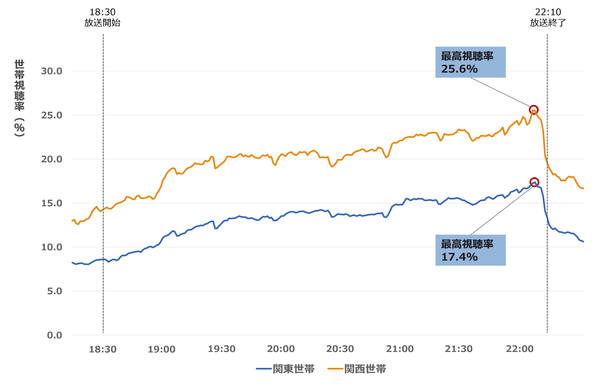 関西エリア・関東エリアそれぞれの世帯視聴率の推移を見ると、例年と同様に19時過ぎから徐々に視聴率が伸び始めています。