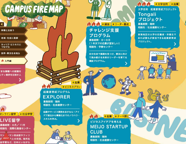 そんな学生の皆さんの声に応え、プログラムや活動をまとめた特設サイト、題して『CAMPUS FIRE MAP』を作成しました。
