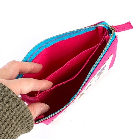 こちらのポーチも3ポケットポーチです。ブラウンやグレーのベーシックなカラーですが、イラストはとってもかわいくて全面に散りばめられています。