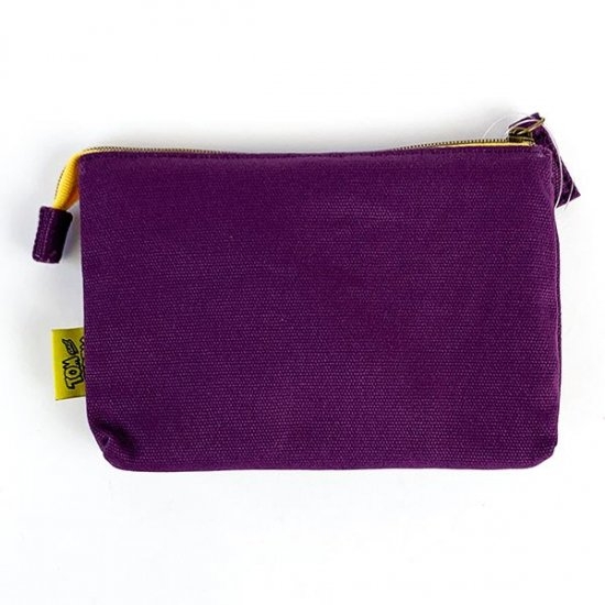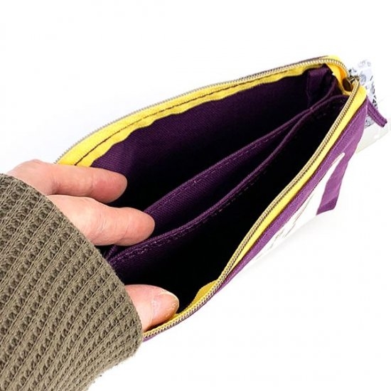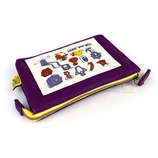 大人っぽい雰囲気のパープルの帆布に、トムやジェリーのファニーなイラストがたくさんデザインされたポーチです。