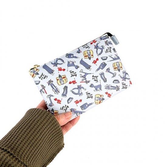 アニメの中にもたびたび登場する、おなじみのシーンのトムとジェリー。お互いにケンカし合って勝ったり負けたりする様子が、ポーチに盛り込まれています♪