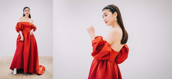 ボリュームのあるオフショルダースリーブが華やかなプリンセスラインドレス
