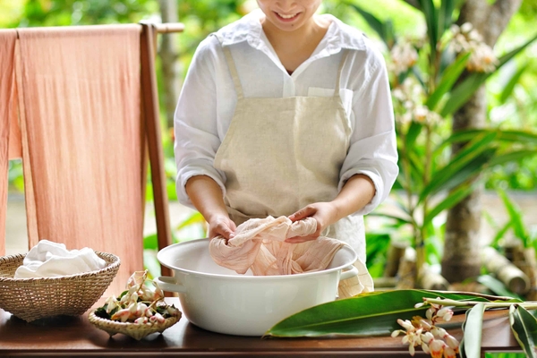 月桃には抗菌・防虫・防カビなどの効果があると言われ、沖縄では古くから月桃を使った草木染めが行われてきました。滞在中は、星のや沖縄のスタッフから月桃にまつわる話を聞き、シルクのストールを染め上げます。まずは、敷地内に自生する月桃を収穫し、葉や根のような根茎を細かく切ります。そして、たっぷりのお湯で煮出して一晩寝かせ、翌日に染色をほどこします。月桃染めは桃色と赤茶色がありますが、花を咲かせる頃の月桃を使用すると華やかなピンク色に染まり、春だけの特別な色が楽しめます。