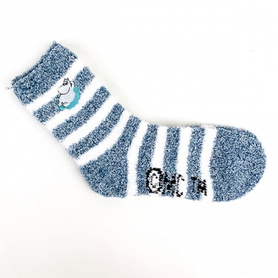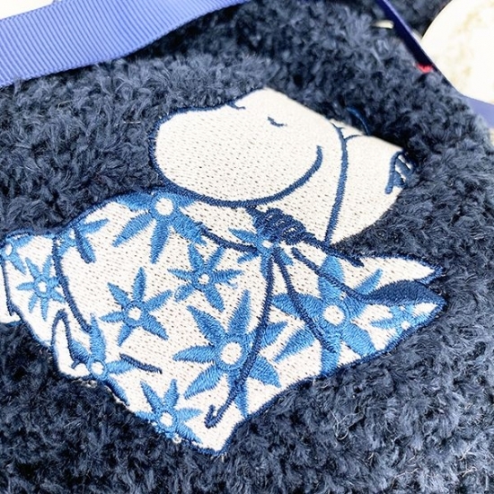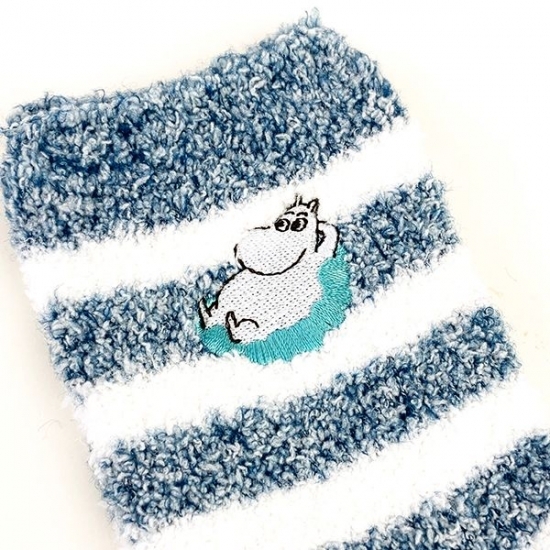 ネイビーカラーに就寝中のムーミンのデザインがキュートな、もこもこ靴下です。青いリボンがまるでラッピングのようで、かわいいんです。