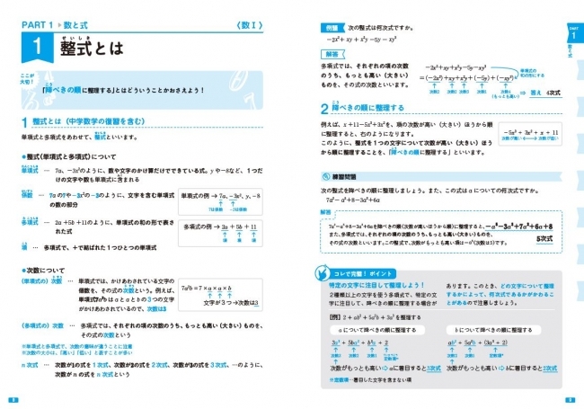 本書は、「はじめから順に読むだけでスッキリ理解できる」構成になっています。また、読む人が理解しやすいように、とにかくていねいに解説することを心がけました。用語の意味からしっかり説明し、シンプルな計算でも途中式を省かずに解説しています。 問題数を多くして演習をうながすのではなく、あくまで日常学習の入門レベルとして使える一冊です。数学アレルギーでもつまずかないように、項目によっては中学数学に立ち返りながら解説していきます。