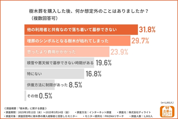 続いて、「樹木葬を購入した後、何か想定外のことはありましたか?(複数回答可)」と質問したところ、『他の利用者と共有なので落ち着いて墓参できない(31.8%)』と回答した方が最も多く、『埋葬のシンボルとなる樹木が枯れてしまった(29.7%)』『思ったより費用がかかった(23.9%)』と続きました。