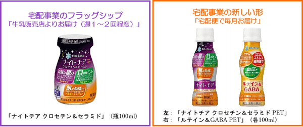 従来のびん商品による週1~2回程度の家庭宅配に加え、新たに宅配便で毎月お届けするPET商品をラインナップすることにより、オートロック住宅や家庭宅配エリア外へのお届けを可能にし、当社宅配事業の新しい形を実現します。