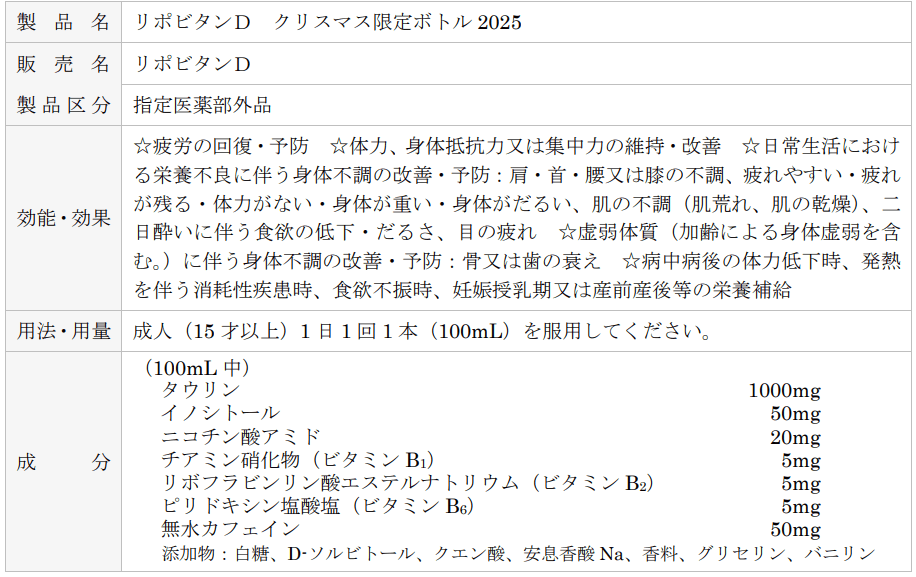 大正製薬株式会社[本社:東京都豊島区 社長:上原 茂](以下、当社)は、2025年のクリスマスを心待ちにする期間を応援する「リポビタンD クリスマス限定ボトル2025」を2025年11月18日(火)から、数量限定、通販限定で当社通販サイト「大正製薬ダイレクト」等にて販売開始いたします。