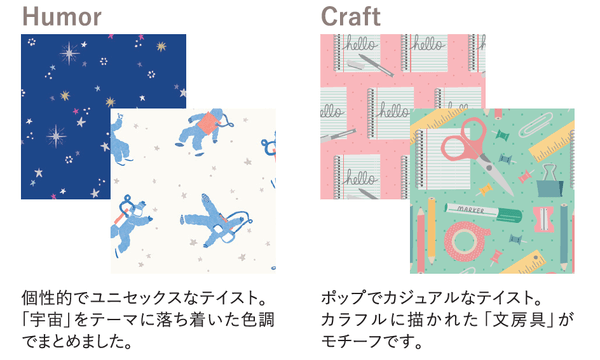 米国ホールマークのクリエイティブアーカイブの中から、4つのアートをテイスト別にアレンジ。「ナチュラル」「スウィート」「ユーモア」「クラフト」の4柄をキュレーション。オフィスでも持ちやすい、ほどよいキュートさがポイントです!