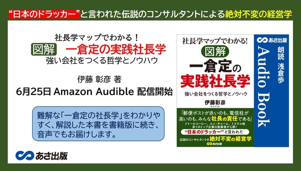 株式会社あさ出版(代表取締役:田賀井弘毅、所在地:東京都豊島区)は、世界最大級のオーディオブック及び音声コンテンツ制作・配信サービスであるAmazon Audibleにて、伊藤 彰彦 著『社長学マップでわかる! 図解 一倉定の実践社長学:強い会社をつくる哲学とノウハウ』の配信を2022年6月25日に開始いたします。