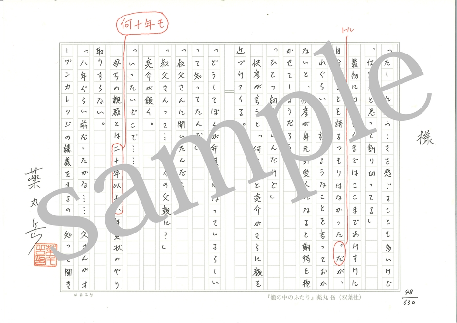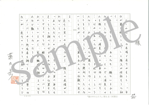 本作の執筆を終えた薬丸さんが、発売にあたり異例の試みを実施。本作のために作成した特製の原稿用紙に全編を手書きし、その生原稿を全国の書店さんや読者の方にお届けします。本作を薬丸さんはパソコンで執筆しておりますが、本キャンペーンのために3か月をかけて630枚を新たに手書きしました。