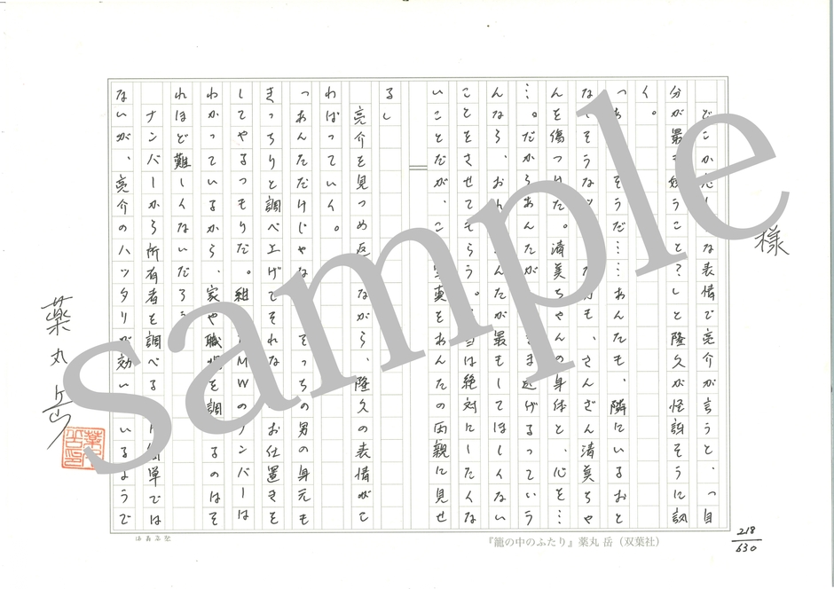 本書を購入いただき、物語の感想と必要事項をご回答のうえ応募いただいた方の中から為書き入りの生原稿1枚を100名様にプレゼントいたします。