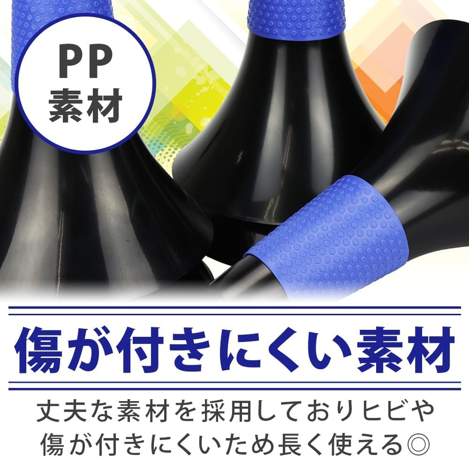 地面に向かって末広がりの形状により安定感が増します。人が通過したときの振動や風が吹いたときの衝撃に強く、簡単に倒れないところがポイント!頻繁に立て直す手間が掛からず、集中してトレーニングに臨めます。本体は軽量ながらも耐久性に優れたPP素材を採用しており、ひび割れや傷に強いため長い間ご愛用いただけます。