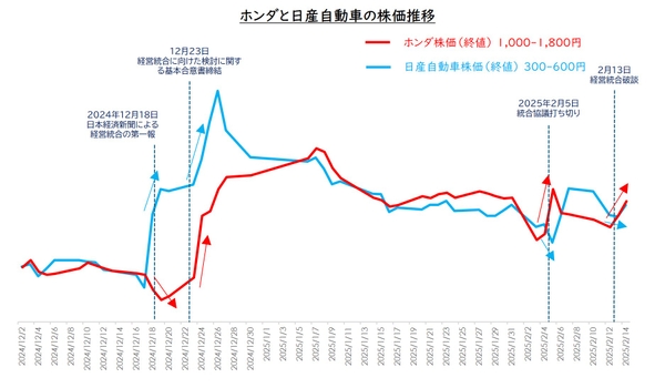 ホンダと日産自動車の24年12月1日~25年2月15日までの株価推移は下記のとおりです。