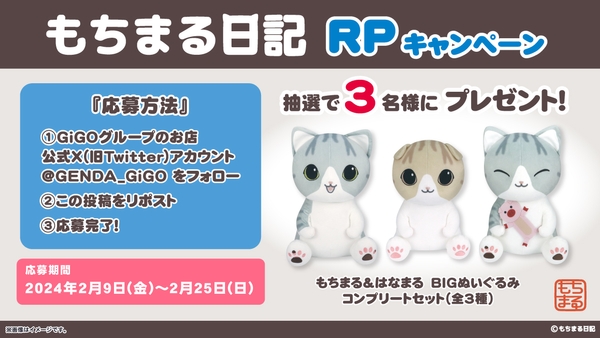 X(旧Twitter)アカウント(https://twitter.com/GENDA_GiGO )をフォローの上で、該当の投稿をリポストされたお客さまの中から抽選で3名様に「もちまる日記 BIGぬいぐるみ~GiGO限定~(全3種)」をプレゼントいたします。