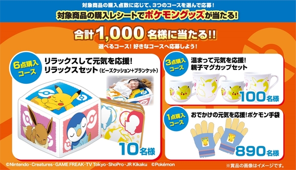 キャンペーンはリポビタンキッズシリーズの「リポビタンキッズゼリー」(清涼飲料水:ゼリー飲料)、「リポビタンDキッズ」(指定医薬部外品)の購入点数に応じた3つのコースで、合計1000名様にポケモングッズが当たります。