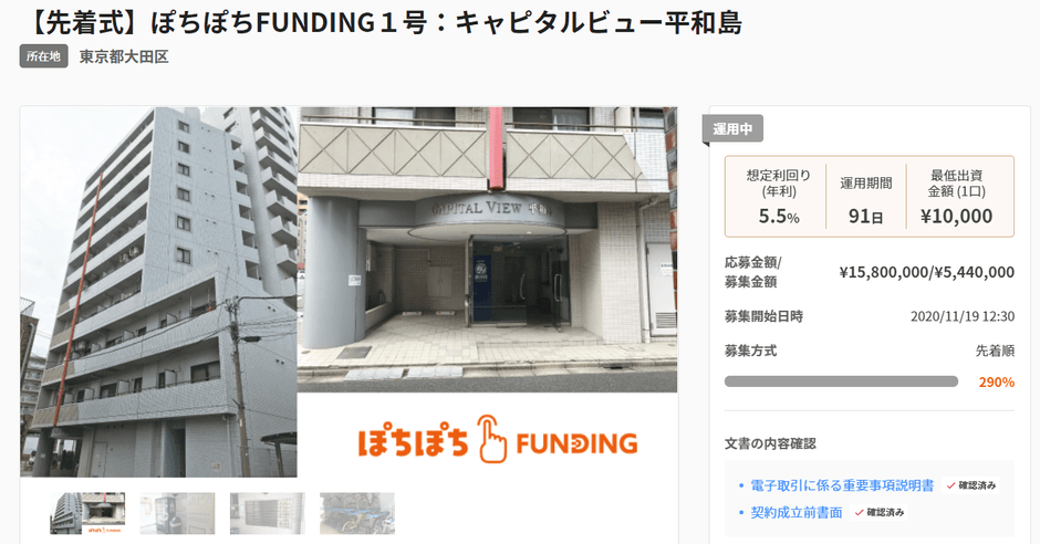 ぽちぽちFUNDING1号:キャピタルビュー平和島 12/8(火)より運用開始