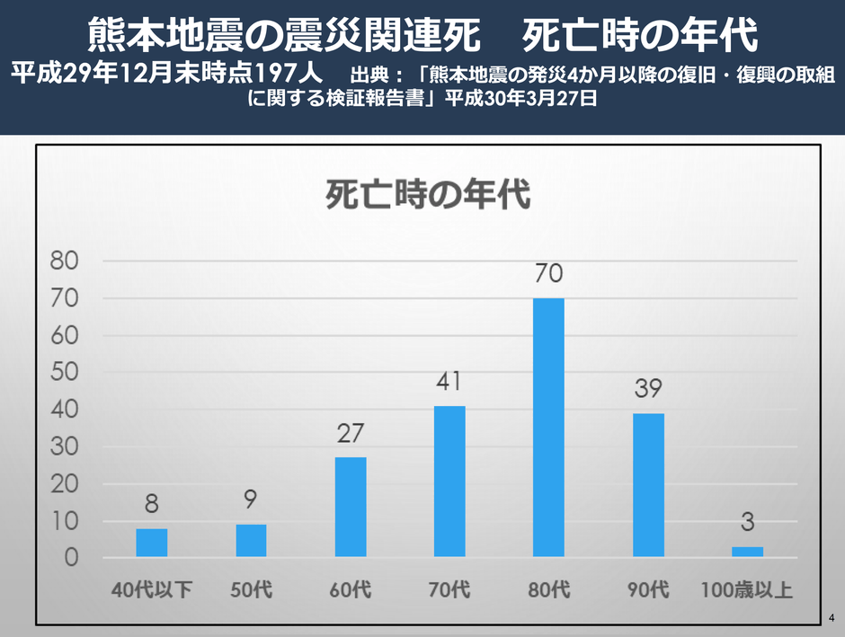 「自宅にいるから安心」ではなく「自宅だから危険」と考えを改めなくてはなりません。このデータを見て以来、私たちボランティアも、早く在宅の被災者を訪問して支援をするとともに、具合の悪い方を発見することが大事というのが常識となっています。