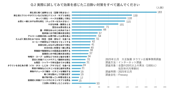 二日酔いの経験者に「実際に効果を感じた二日酔い対策」を聞いたところ、「飲む前に軽く食事を取る(空腹で飲まない)」(183人)、「飲む前にウコンやタウリンなどを含むドリンクやサプリを飲む」(130人)、「ゆっくり飲む・ペースを意識して飲む」(118人)、「お酒と一緒に水やお茶を飲む(チェイサーを欠かさない)」(115人)、「十分な休養・睡眠を取る」(101人)といった対策をしている方が多くいました。済生会横浜市東部病院の谷口英喜先生によると、翌日の体調不良の本質は、“脱水”と“肝臓の疲弊”にあるということ。アルコールの分解には多くの水とエネルギーが消費され、肝臓がフル稼働した結果、体全体の代謝とエネルギー供給が低下してしまうのです。