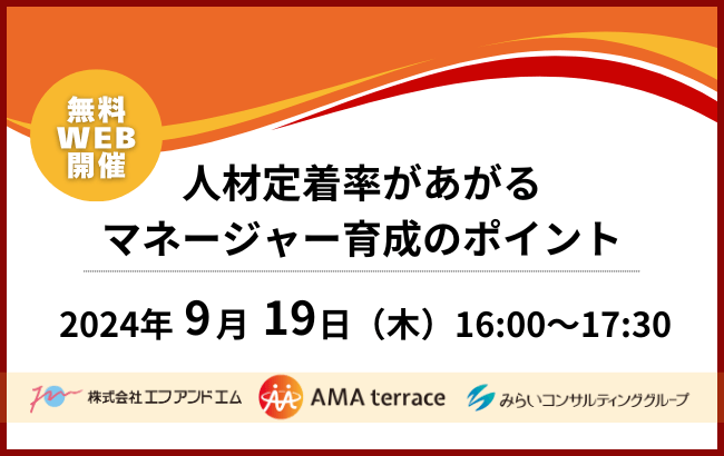 みらいコンサルティンググループ(本社:東京都中央区、代表:久保 光雄 岡⽥ 烈司)は、セミナー『人材定着率があがるマネージャー育成のポイント』を2024年9月19日にWEBにて開催いたします。
