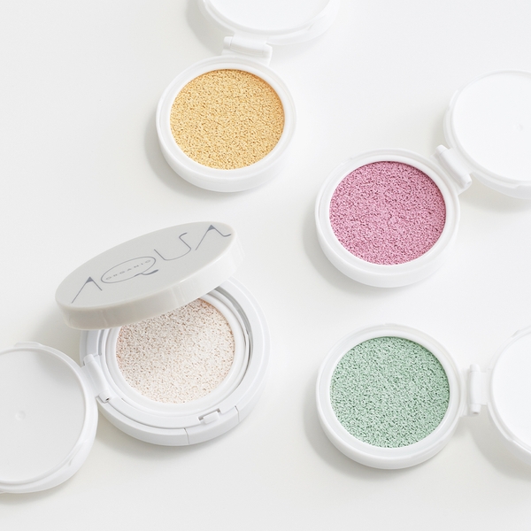 アクア・アクアのコントロールカラーベースはクッションタイプ。フルーツエキスや植物オイルなどの保湿成分がたっぷりクッションに含まれており、メイクをしながらスキンケアをするように肌に潤いを与えます。