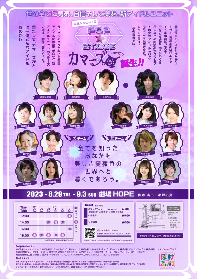 SFIDA ENTERTAINMENT(代表:小郷拓真)主催、『POP☆STAGE season1.5 世の全てに勇気、自信そして美を。 新アイドルユニット、カマーズ26誕生!!』が2023年8月29日 (火) ~2023年9月3日 (日)に劇場HOPE(東京都中野区)にて上演されます。