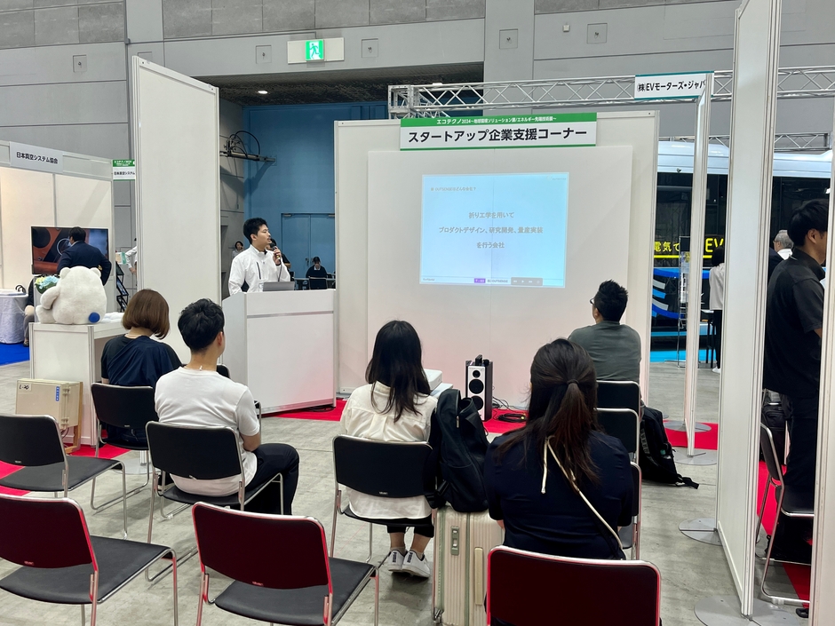 会期中は全日、「エコテクノ」スタートアップ企業支援コーナーにて代表の高橋がピッチを行い、企業紹介や「折り工学」による様々な設計手法・製造方法などをご紹介させていただきました。