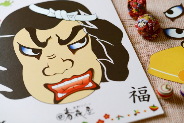 ねぶたの顔の輪郭を描いた台紙の上に、目や鼻、口、ひげなどのパーツを目隠しした状態で乗せていきます。完成したねぶた福笑いが、勇ましい顔や困った顔、こっけいな顔になるところが楽しさのひとつです。大人も子どもも楽しむことができ、完成した福笑いを見て思わず笑顔がこぼれます。