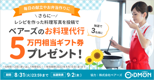 さらに8月31日23時59分までに、レシピを実際に作ったお料理写真を、ハッシュタグ「 #コドモン保護者応援レシピ」をつけてアップしてくれた方には、長期休みで使えるベアーズの料理代行ギフト券をプレゼント(次の春休みまで使えます)