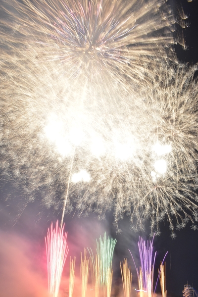 高さ・直径ともに大観覧車レインボーの2倍以上で目の前を覆いつくす花火は火薬の熱さを感じるほど。