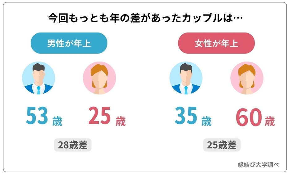 もっとも年の差があったご夫婦は、夫が年上のケースでは結婚時点で夫53歳・妻25歳の「28歳差」、女性が年上のケースでは、夫35歳・妻60歳の「25歳差」でした。