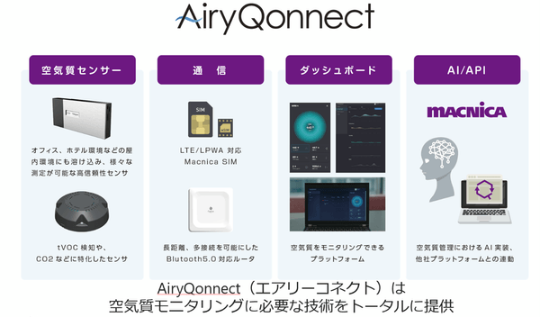 AiryQonnectは、マクニカが提案する空気質モニタリングソリューションです。温湿度、CO2、TVOCガス、PM2.5など空気環境を計測するために必要な高精度センサーと共に、LTE SIM・BLEルーターの無線通信機能、取得したデーターを可視化するダッシュボード、APIによる外部連携など空気質モニタリングに必要な要素をトータルで提供します。