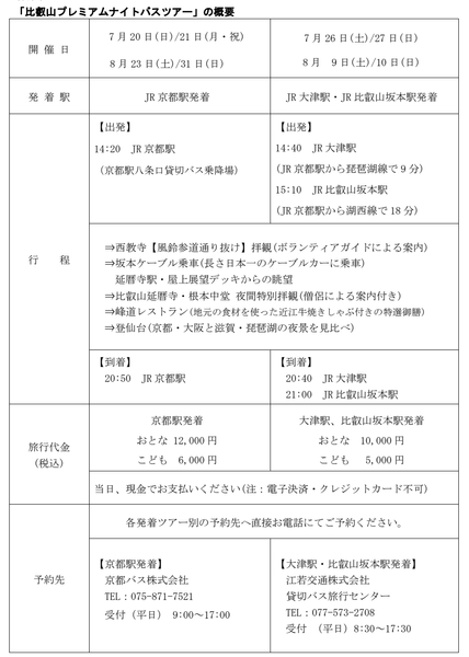 ~ 自然と祈りの比叡山へ、7月・8月開催 ~ 「夏の比叡山プレミアムナイトバスツアー」を6月9日販売開始