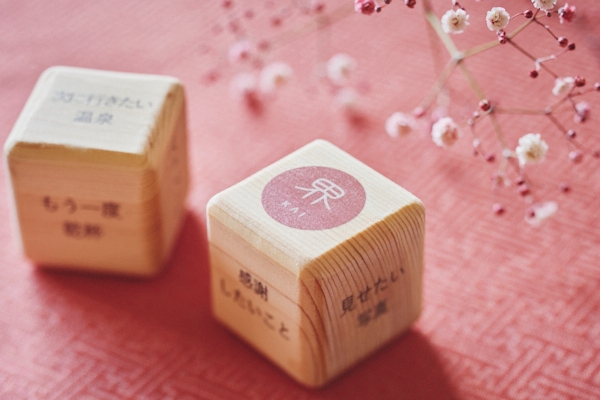 会えなかった時間の出来事を、同行者同士でわかちあえるよう、界の「再会トークサイコロ」を提供します。ヒノキから作られた木のぬくもりを感じるサイコロ。手にとると木のいい香りが漂います。キューブの各面には、「感謝したいこと」、「見せたい写真」、「次に行きたい温泉」などのトークテーマが書かれており、サイコロを振ってでた賽の目でサイコロトークを楽しめます。サイコロの角は、丸く加工され、小さいこどもが手に取っても安心です。老若男女問わず、客室内のテーブルを囲み、ころころと転がして、再会の喜びをわかちあうおしゃべりが弾む夜を過ごすことができます。