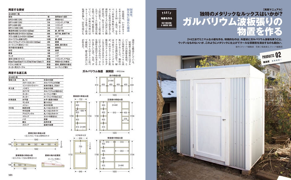 物置をつくるために必要な資材一式と各部寸法が詳細に記載された展開図、さらに作業で必要となる工具一式を紹介。このままの仕様で作るのもヨシ、自分にあったサイズやデザインにアレンジするのもアリだ。