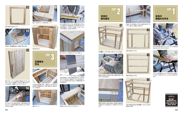 各工程を写真入りでわかりやすく解説。各部分の細かい寸法や使用するネジの長さ、工具の使い方のコツまで、順を追って丁寧に紹介します。きれいに仕上げるためのワンポイントアドバイスも掲載。