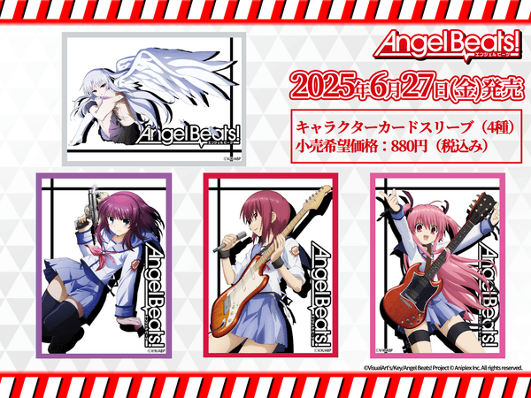 アニプレックスより、「Angel Beats!」のスリーブが登場!!同時発売のブースターパック Angel Beats!と合わせて揃えたいオススメの商品です!フィーチャーするキャラクターは「ゆり」、「天使」、「ユイ」、「岩沢」と非常にファンからも人気のある4キャラ。自分の"推し"のスリーブでゲームを遊ぼう!