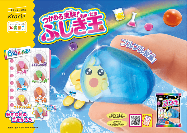 「つかめる実験!ふしぎ玉」は、粉と水を混ぜることで、液体が手でつかめる「ふしぎ玉」を作ることができる実験要素たっぷりの知育菓子®です。プルプルの水の玉をつかむという驚きの体験と、見た目の楽しさ・味わいが重なり合い、2018年の発売以来、多くのお子さまや保護者の方々に親しまれてきました。