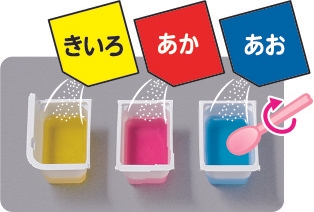 そのため今回のリニューアルでは、「あか・あお・きいろ」の3原色から、「オレンジ・みどり・むらさき」を作って楽しめるように設計を見直し、最大6色のふしぎ玉を作れるようにしました。色のバリエーションが一気に広がることで、見た目の楽しさも、体験の自由度も大きく向上しています。