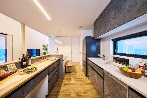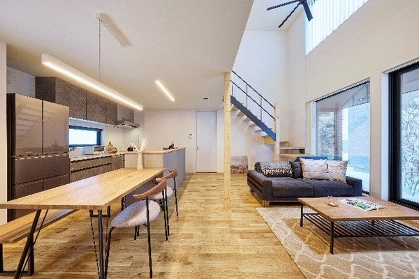 デザイン×性能×保証×中間領域をご提案。雪深い地域だからこそ屋根付きのデッキスペースがアウトドアリビングとして春夏秋冬、全ての季節で重宝。吹き抜けを介して繋がる空間が面積ではなく体積で考える空間をご提案します。また、サンコーホームオリジナルシステム「全館冷暖房ダブル空気清浄システム」の搭載により広い空間で快適にお住まいいただけます。