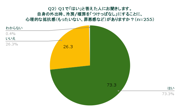 Q1で「冷暖房をつけっぱなしにする」と回答した人を対象に、自身の外出時に冷暖房をつけたままにすることに対し、「もったいない」「罪悪感がある」などの心理的な抵抗感を感じるかを質問したところ、「はい」と答えた人は約7割に上りました。
