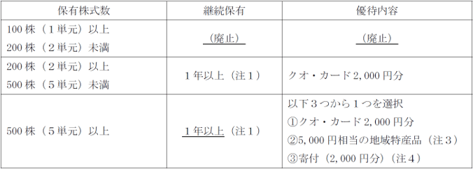 さらに、保有株式数ごとの利益還元のバランス及び株主配当とのバランスの観点から総合的に検討を重ねた結果、以下のとおり株主優待制度を一部変更させていただくことといたしました。