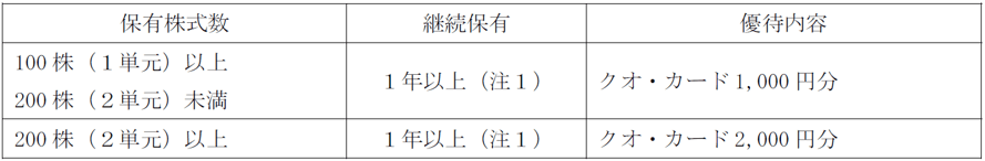 (注1)継続保有期間1年以上とは、同一株主番号で6月末日及び12月末日の株主名簿に各保有株式区分以上の株式を保有していることが連続して3回以上記載または記録されていることといたします。