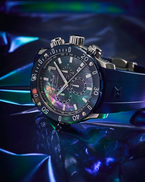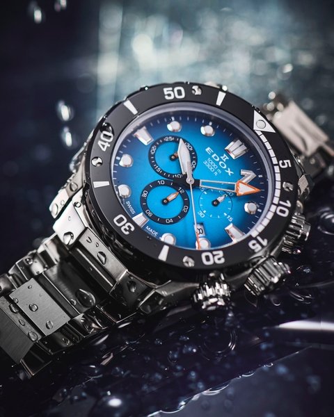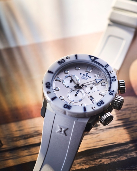 最高速度が200km/hを超え、海のF1とも称されるパワーボートレースのダイナミックかつラグジュアリーな世界観を投影した、エドックスのフラッグシップコレクションです。厚さ3.5mm以上の重厚なセラミックベゼルや300~1000m防水を標準スペックとして備え、素材や仕上げへの一切の妥協を許さず審美性を追求することで、タフネスとエレガンスを両立しています。