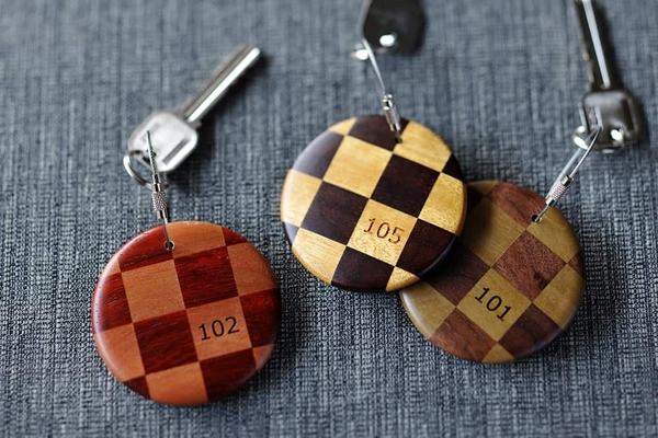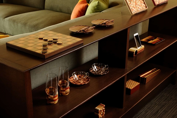 界 箱根の館内では、様々なシーンで箱根寄木細工の作品を手にとって、実際に使うことができます。客室「箱根寄木の間」には、ルームキーホルダーや掛け軸などに寄木細工の意匠が施されています。木の風合いを大胆に活かした大柄のデザインが、和の趣ある客室や窓から望む須雲川や湯坂山の景観に馴染みます。