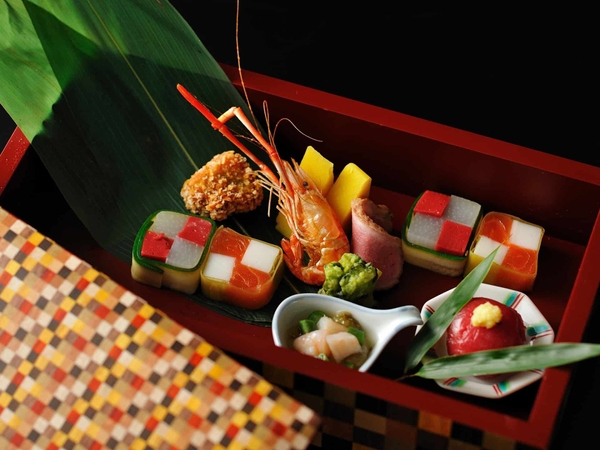 17:30 箱根寄木細工の器で供される会席料理を味わう