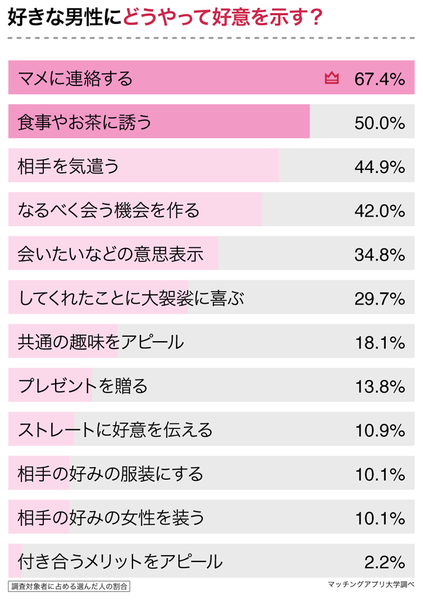 「好きな男性にどうやって好意を示しますか?」と聞いたところ、1位は「マメに連絡する(67.4%)」、2位は「食事やお茶に誘う(50%)」、3位は「相手を気遣う(44.9%)」でした。