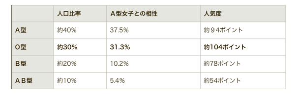 ランキングではA型男子が1位でしたが、人口比率が高いことを加味すると人気度では僅差でO型が1位でした。
